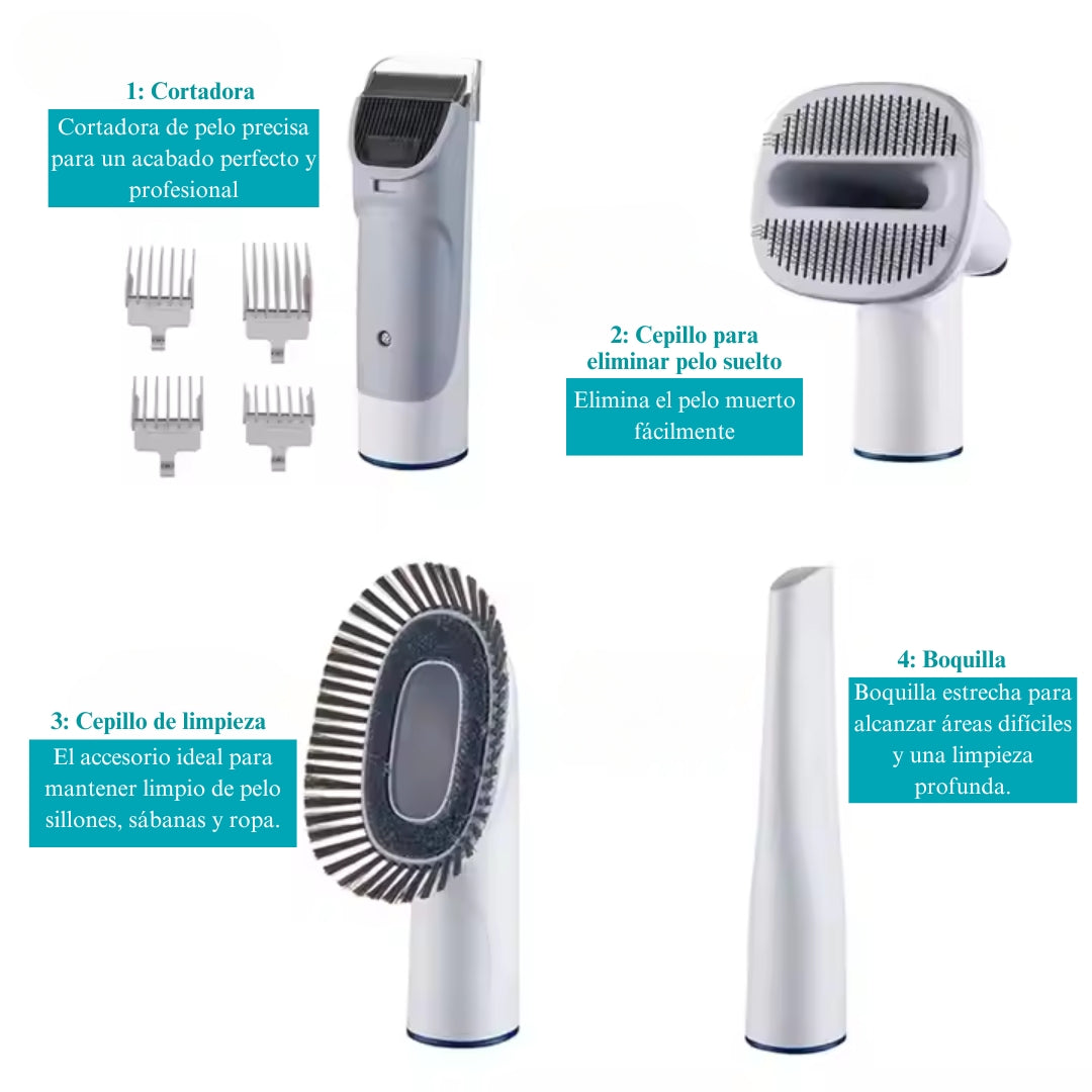 A diferencia de una aspiradora convencional, esta fue diseñada específicamente para eliminar el pelo de mascotas, aspirando el pelo mientras lo peinas, evitando que vuele o se adhiera a telas. Además, incluye accesorios para tapizados, rincones difíciles y una cortadora de pelo que recorta y aspira al mismo tiempo, sin dejar desorden.